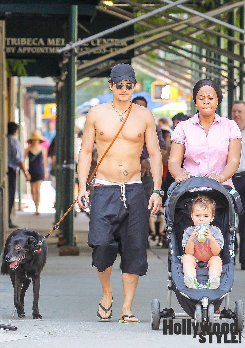 Orlando Bloom luce sexy mientras presume su cuerpo sin camisa mientras toma un paseo con su mascota Sidi el martes (16 de julio) en la ciudad de Nueva York.